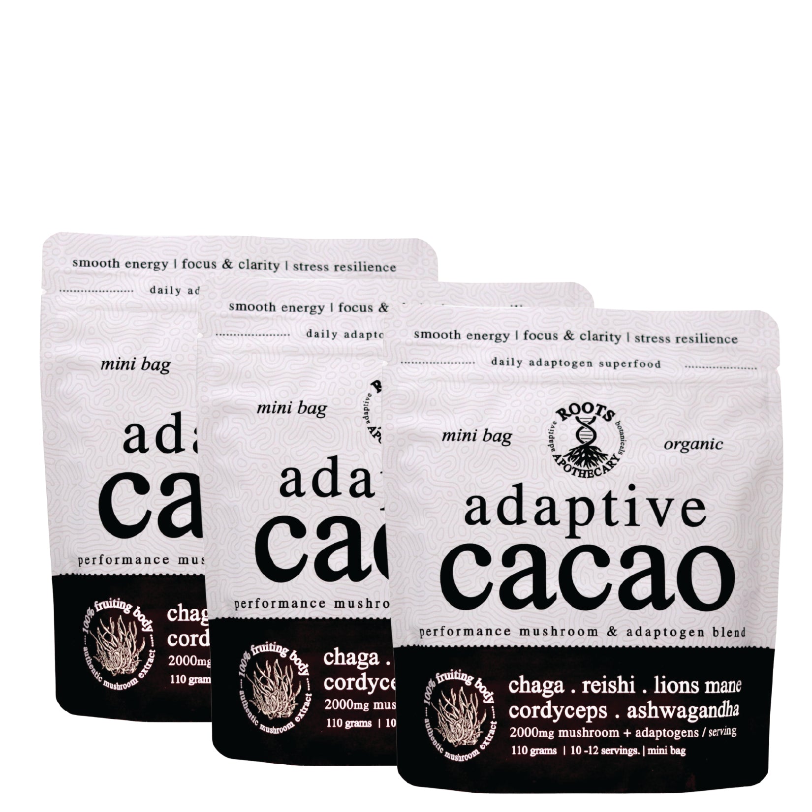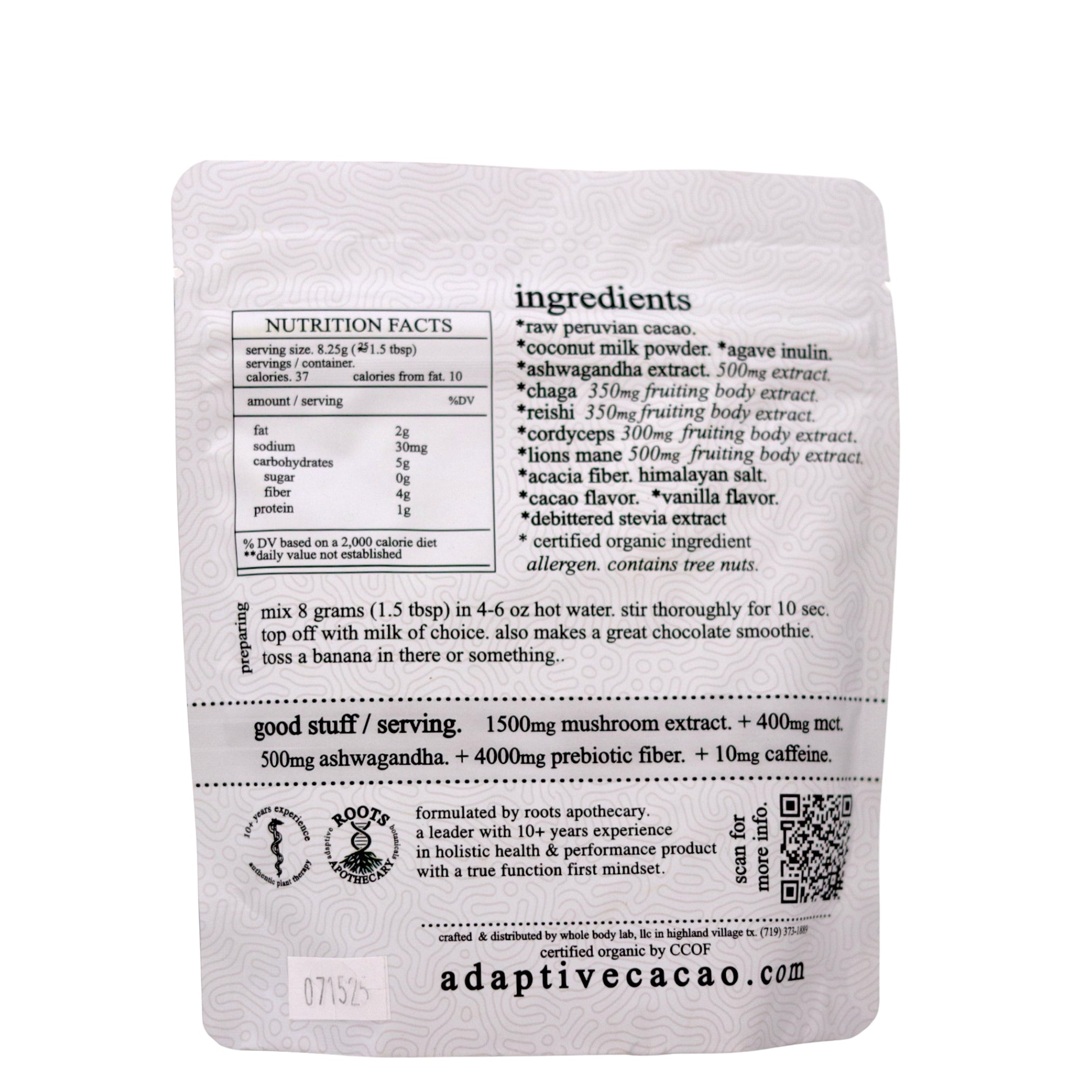 adaptive cacao blends have a wide range of holistic benefits with rich & powerful anti-oxidants, prebiotic fiber, vitamins, minerals and phytonutrients. authentic chaga is one of the most powerful antioxidants in the world with an orac rating of 52,000 and is known for improving immune response and balancing inflammation. ashwagandha & reishi are some of the most fundamentally beneficial remedies on the planet with powerful immune boosting and stress balancing properties that strengthen your body’s ability to heal itself. cordyceps and lions mane energize the mind and body for endurance and resilience to conquer life’s many challenges. roots apothecary adaptive cacao is the ultimate holistic combination for overall mental and physical health.