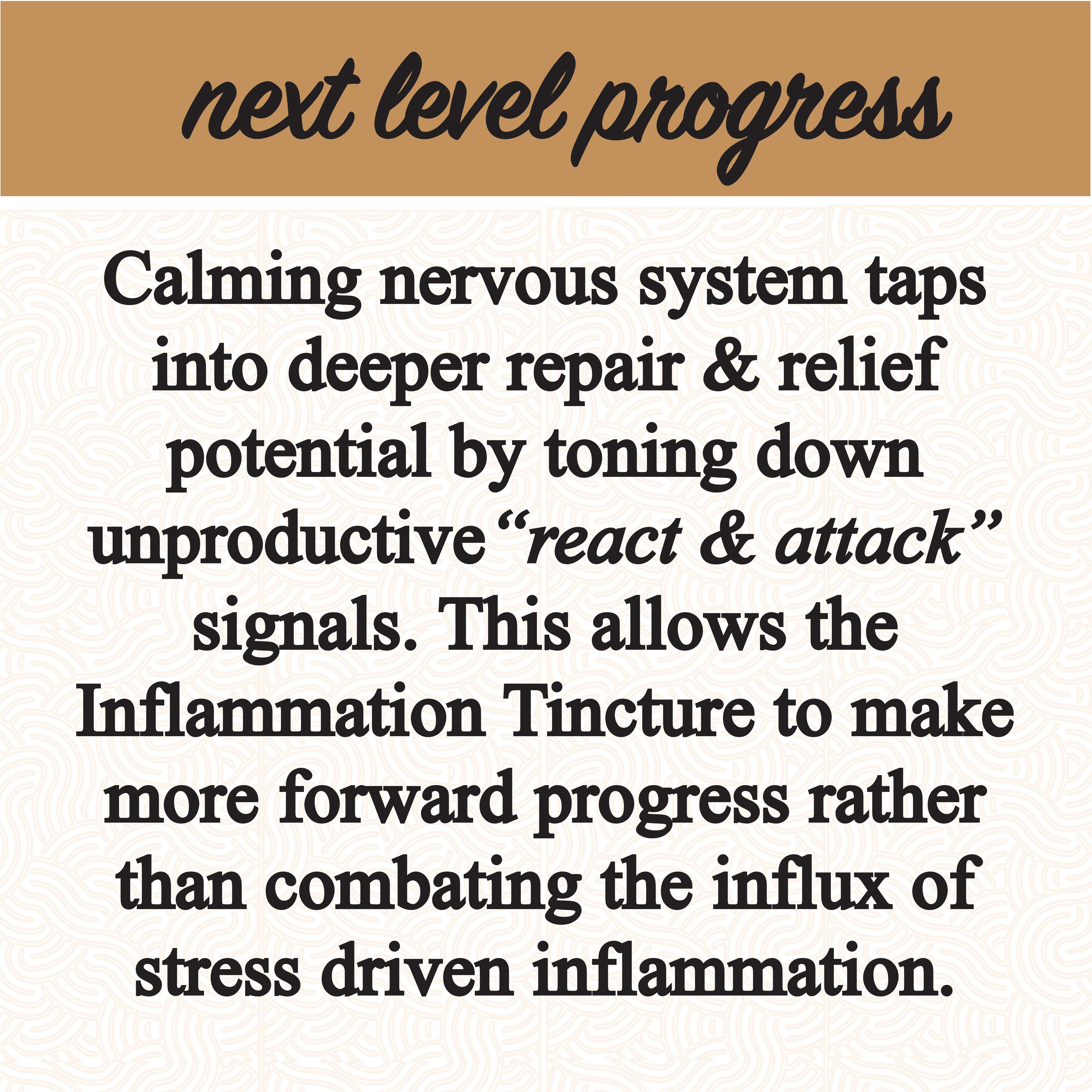 When the nervous system is in a state of chronic tension, the mind-body receives continuous “react & attack” signals that keep inflammation elevated. High quality anti-inflammatory and anti-oxidant compounds will offer significant relief by lowering circulating cytokin levels, but the underlying neural directive (given by the nervous system in tension) continues to drive inflammation into the system. this is why quality inflammation supplements will work, but progress will plateau and leave significant healing opportunity untapped. Layering a quality nervous system supplement into the routine, like the holy basil tincture, will amplify progress by allowing anti-inflammatory compounds to work synergistically with the mind-body instead of combating the stream of inflammation fueled by a stressed nervous system. this synergy breaks through the plateau and promotes real system-wide progress that set in more deeply.