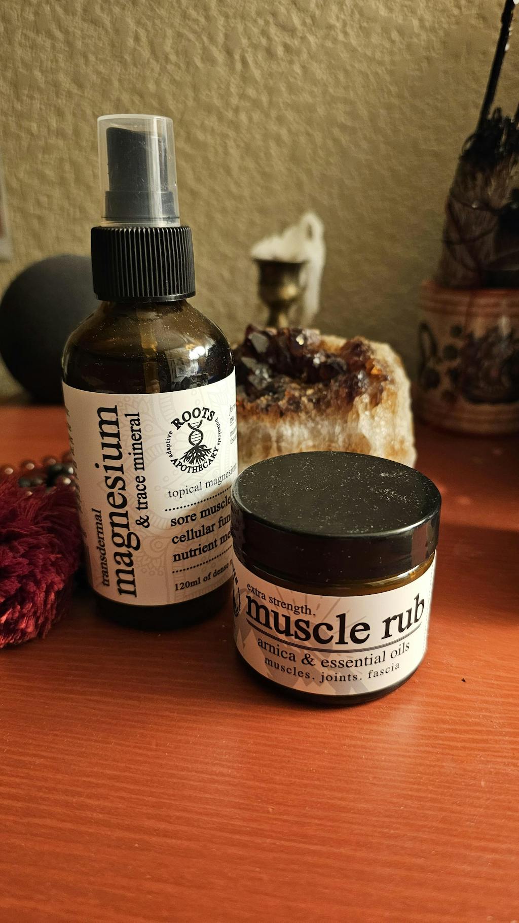 roots apothecary muscle rub is a well-rounded and powerful blend of house arnica extract and steam-distilled essential oils with a potent 20% menthol content. we never use emulsifiers, synthetic colors, sythetic scents or preservatives. our muscle run is 100% functional.