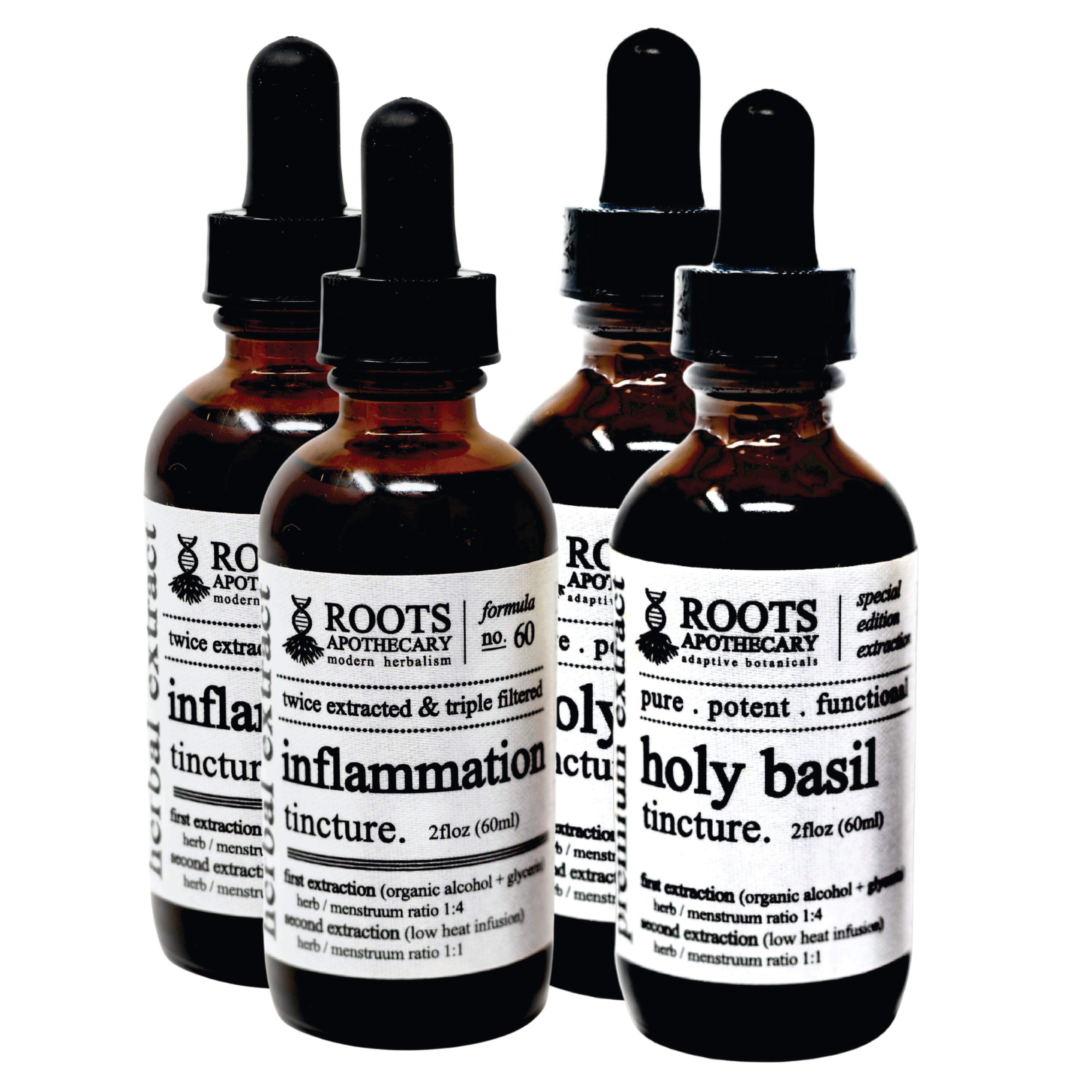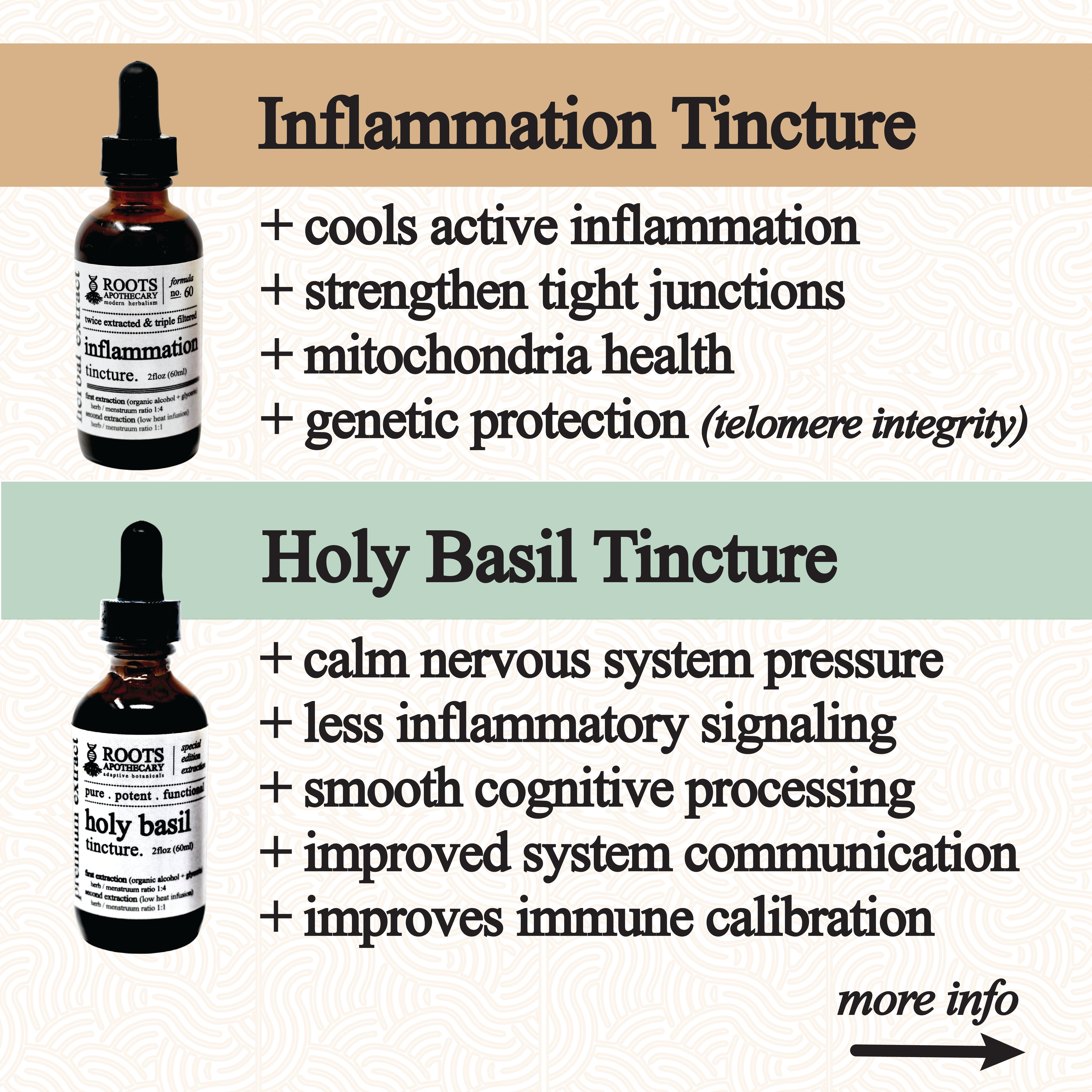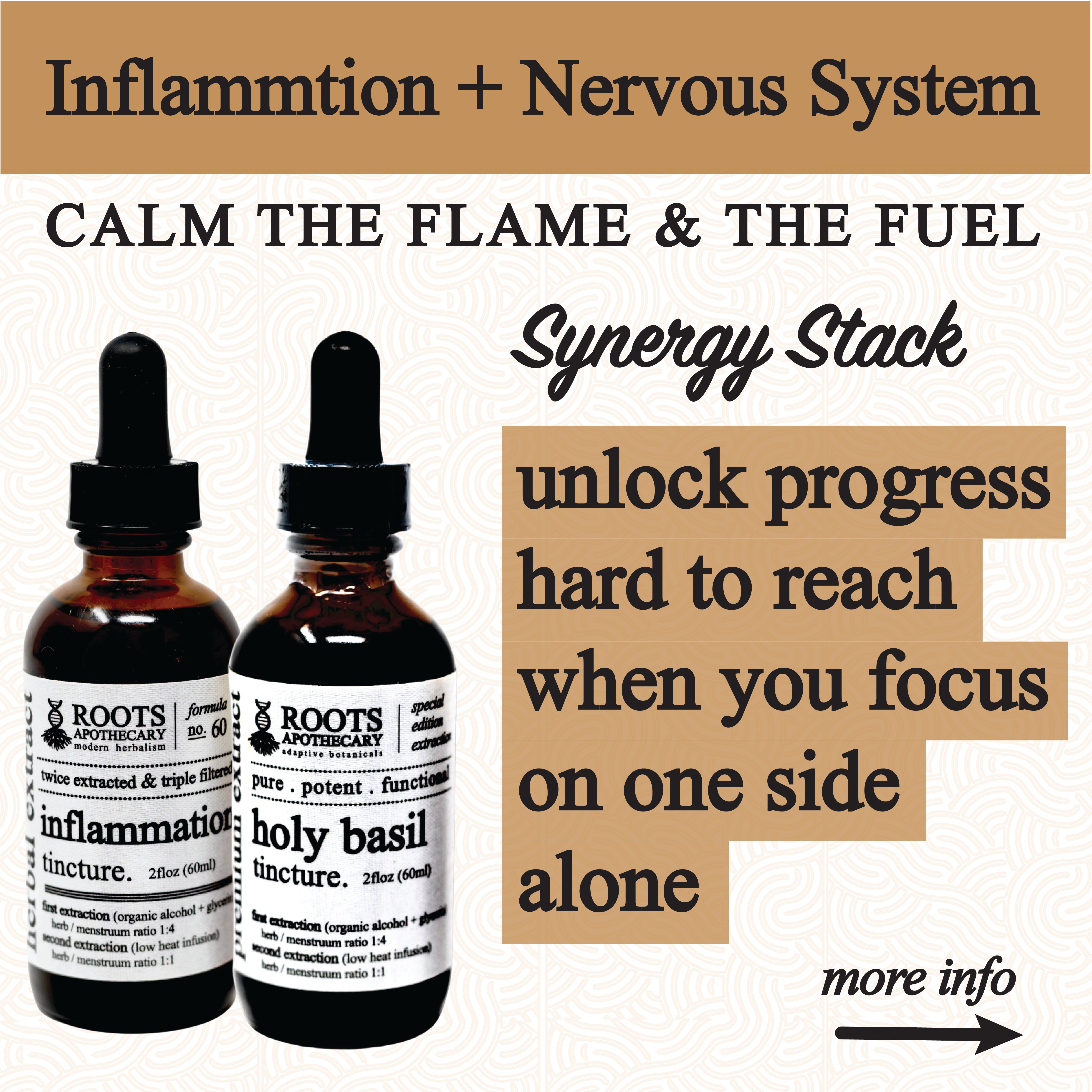 When the nervous system is in a state of chronic tension, the mind-body receives continuous “react & attack” signals that keep inflammation elevated. High quality anti-inflammatory and anti-oxidant compounds will offer significant relief by lowering circulating cytokin levels, but the underlying neural directive (given by the nervous system in tension) continues to drive inflammation into the system. this is why quality inflammation supplements will work well in the short term, but progress will plateau and leave significant healing opportunity untapped. layering a quality nervous system supplement into the routine, like the holy basil tincture, will amplify progress by allowing anti-inflammatory compounds to work synergistically with the mind-body instead of combating the stream of inflammation fueled by a stressed nervous system. this synergy breaks through the plateau and promotes real system-wide progress that set in more deeply.